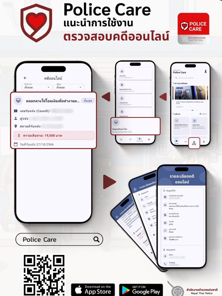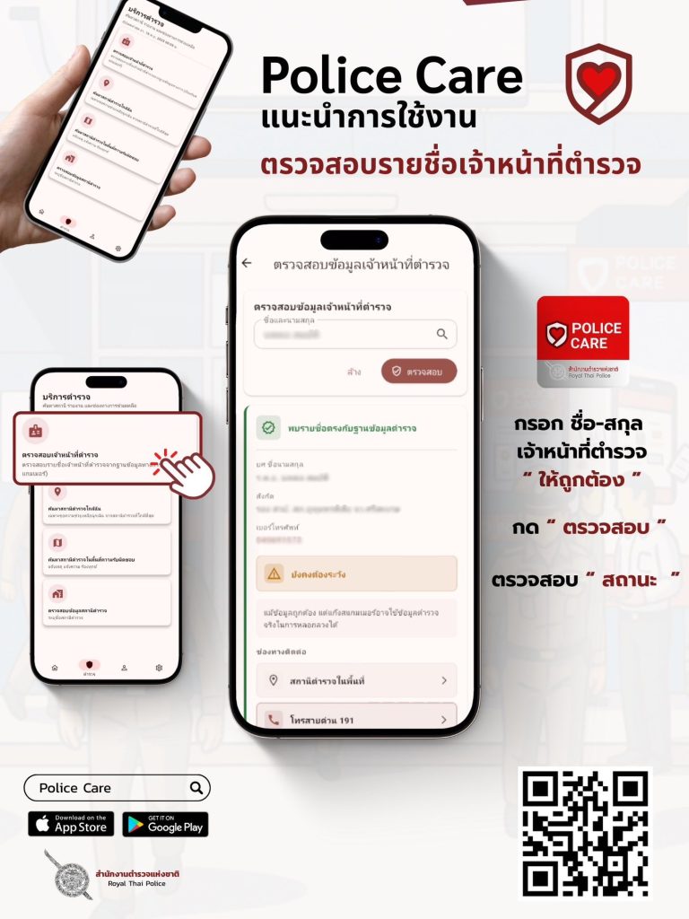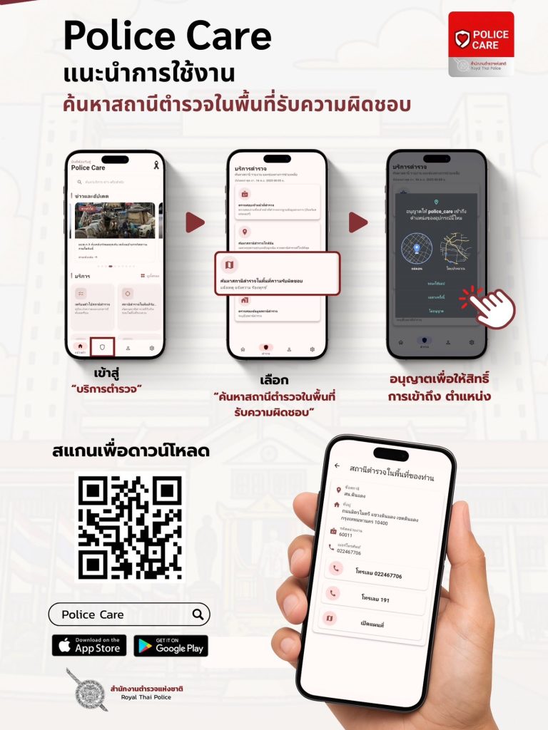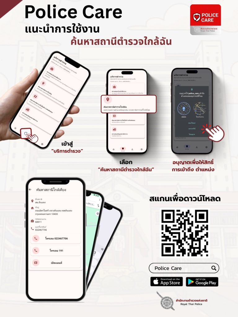 👮♂️📱 แอปพลิเคชัน “Police Care” ตำรวจห่วงใยประชาชน 💙 สำนักงานตำรวจแห่งชาติ เปิดตัวแอปพลิเคชัน “Police Care” แอปเดียวจบ! เพื่ออำนวยความสะดวกและดูแลความปลอดภัยของประชาชน รวมข่าวสารและบริการสำคัญของสำนักงานตำรวจแห่งชาติ ใช้งานง่าย 📲 รวดเร็ว ⚡ และปลอดภัย 🔐✨ ฟังก์ชันเด่นภายในแอป 🔍 ค้นหาสถานีตำรวจในพื้นที่ 🛑 ตรวจสอบตำรวจปลอม 💻 ตรวจสอบคดีออนไลน์ 📖 ตรวจสอบการลงบันทึกประจำวัน 🧾 ตรวจสอบข้อมูลใบสั่ง เพราะ ความห่วงใย อยู่ใกล้แค่ปลายนิ้ว 🤝📥 ดาวน์โหลดแอป “Police Care” เพื่อประชาชนได้แล้ววันนี้ทั้ง 👉 Play Store และ App Store
