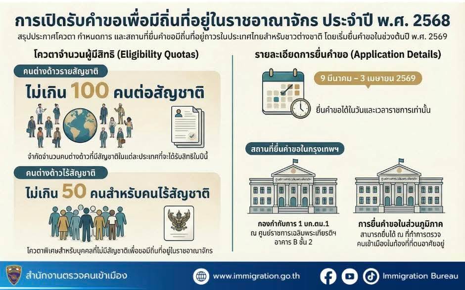 The Office of the Prime Minister and the Ministry of Interior have issued an announcement dated 26 February B.E. 2569 regarding the annual quota for foreigners permitted to obtain permanent residency in the Kingdom of Thailand for the year B.E. 2568, as follows: