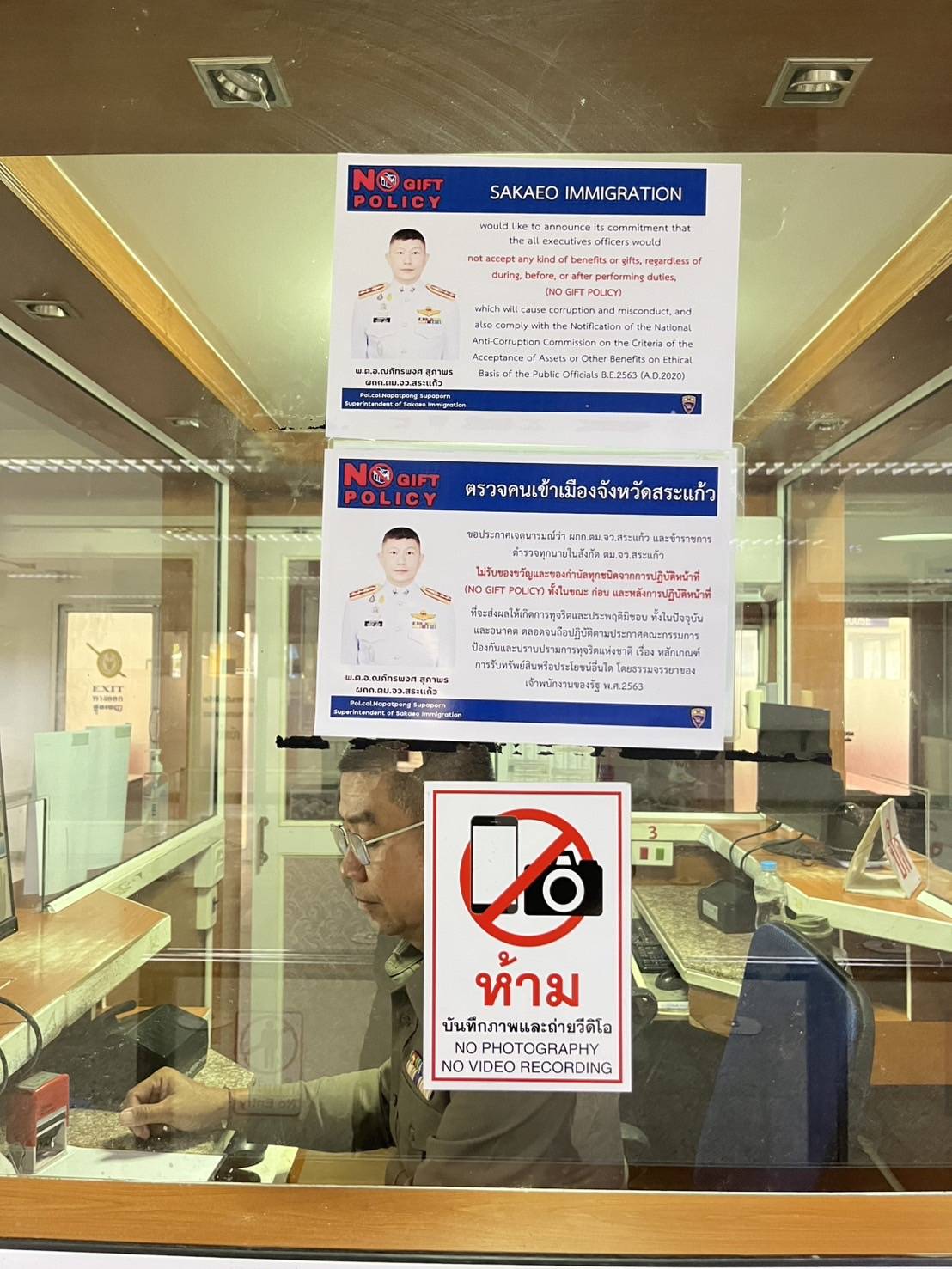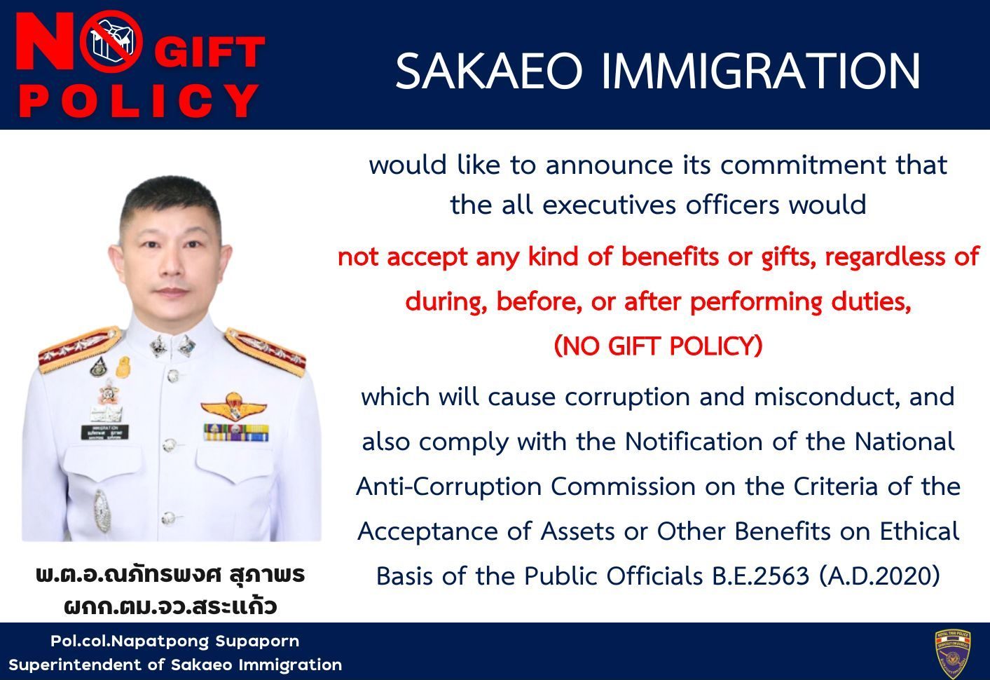 3. ประกาศเจตนารมณ์ไม่รับของขวัญ ของกำนัลทุกชนิด (No Gift Policy) ของ ผกก.ตม.จว.สระแก้ว
